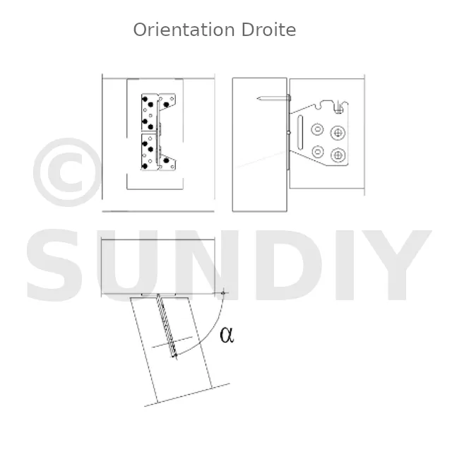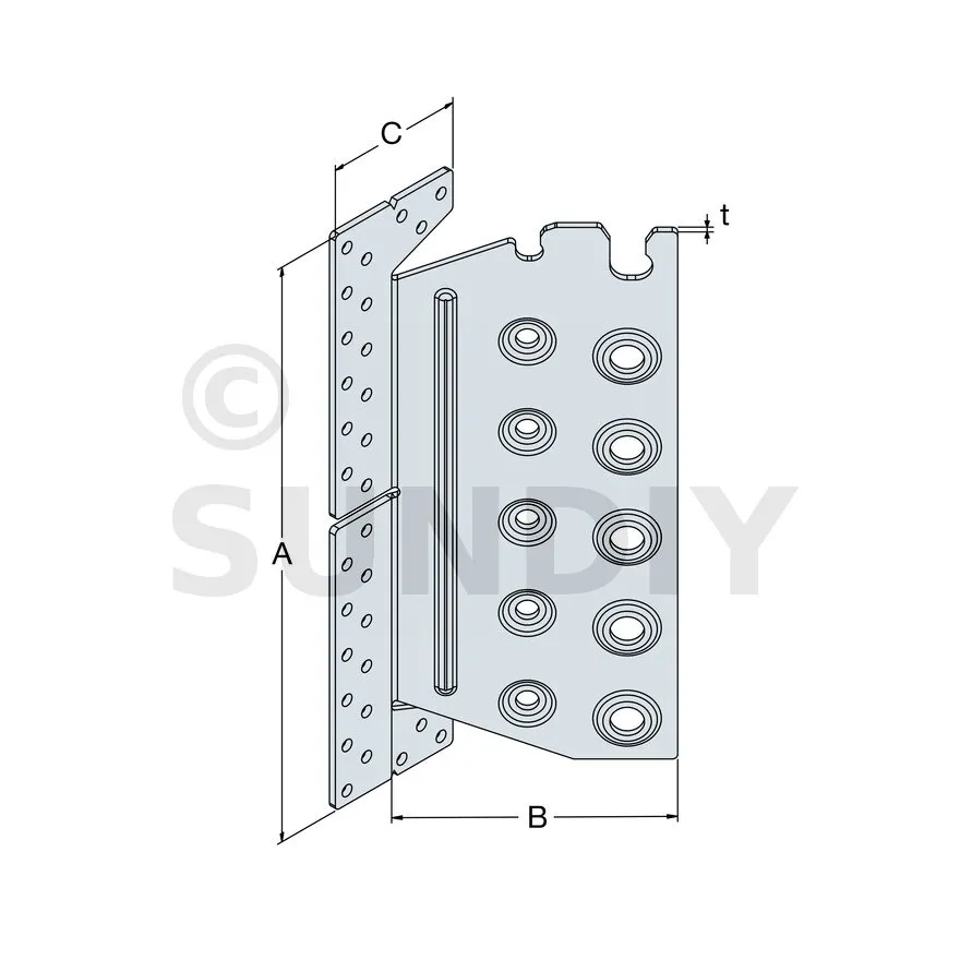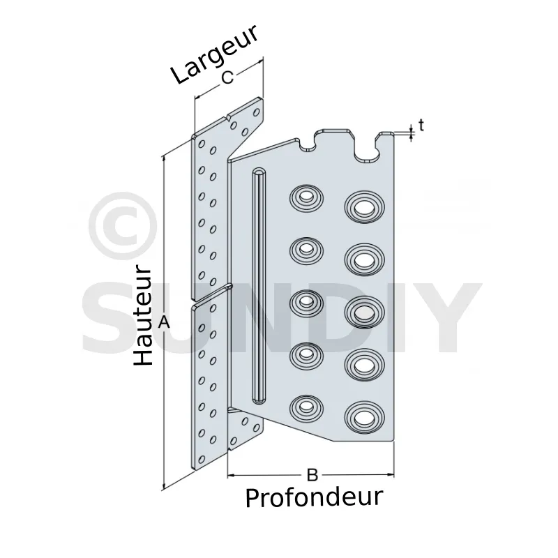 | Largeur | Hauteur | Largeur poteau | A | B | C | t | α [°] | Ø5 | Ø8,5 | Ø12,5 | ||||||