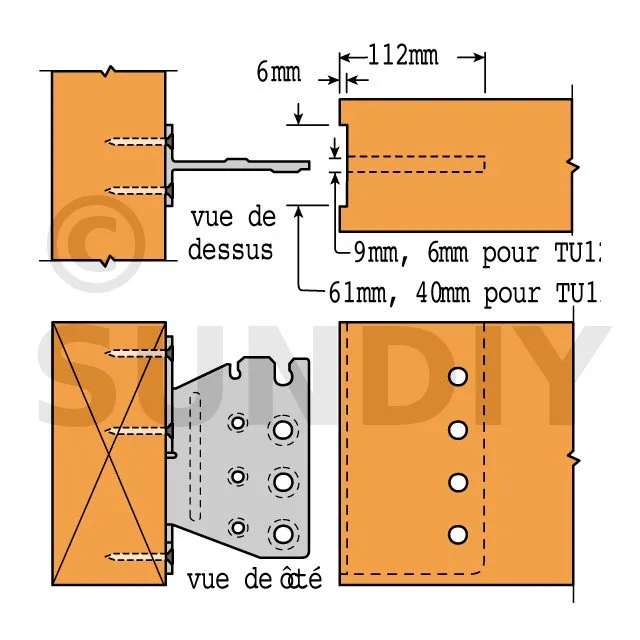 1- Réaliser une entaille verticale dans la poutre portée (largeur 6 mm pour le TUS12 et largeur 9 mm pour les TUS16 à TUS28),