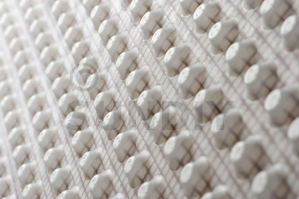 - DELTA®-PT possède des alvéoles de 8 mm de hauteur qui créent un espace isolé entre la paroi humide et la nouvelle couche de finition. Cette configuration permet de créer une nouvelle surface saine et sans humidité ni moisissure.
