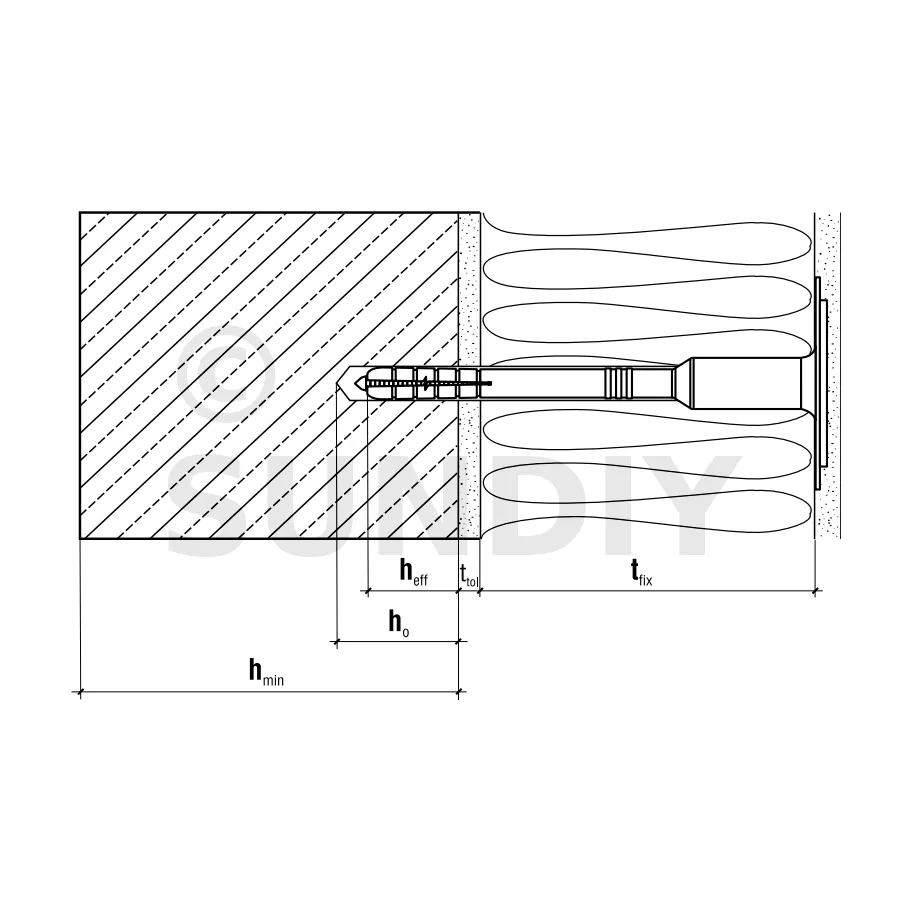 Longueur minimale de la cheville Ld = tfix + ttol + heff avec tfix : épaisseur maximale des pièces à fixer, ttol : épaisseur des sous-couches (adhésif + enduit existant), heff : profondeur d’ancrage.