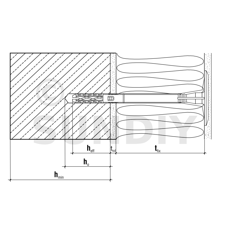 Longueur minimale de la cheville Ld = tfix + ttol + heff avec tfix : épaisseur maximale des pièces à fixer, ttol : épaisseur des sous-couches (adhésif + enduit existant), heff : profondeur d’ancrage.