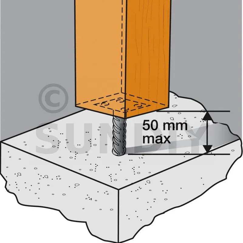 En auto construction, on prend souvent 300 mm, mais ici, pour conserver la certification ETA-07/0285, la tige de 200 mm doit être entièrement entourée de béton ; comptez donc mini 350 mm de profondeur de forage ou de plot.