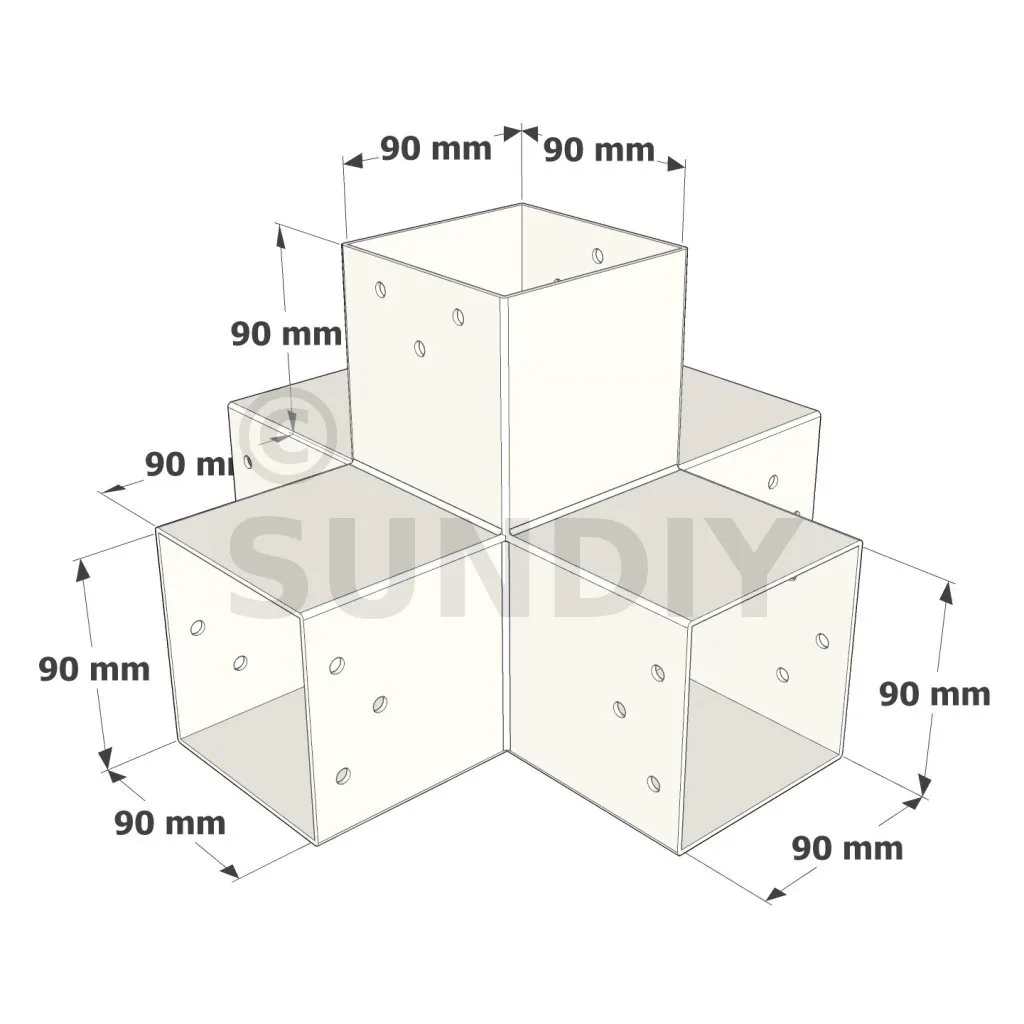 Il permet de raccorder deux poutres 90x90mm perpendiculairement à une autre poutre 90x90mm, le tout étant supporté par un poteau vertical de 90x90mm.