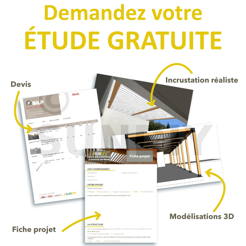 Ici, vous allez pouvoir ESTIMER RAPIDEMENT le coût de votre projet à base de kit pergola bioclimatique SUNDIY, vous-même. C’est FACILE, choisissez le type de structure puis remplissez le formulaire en indiquant vos dimensions et les options choisies.