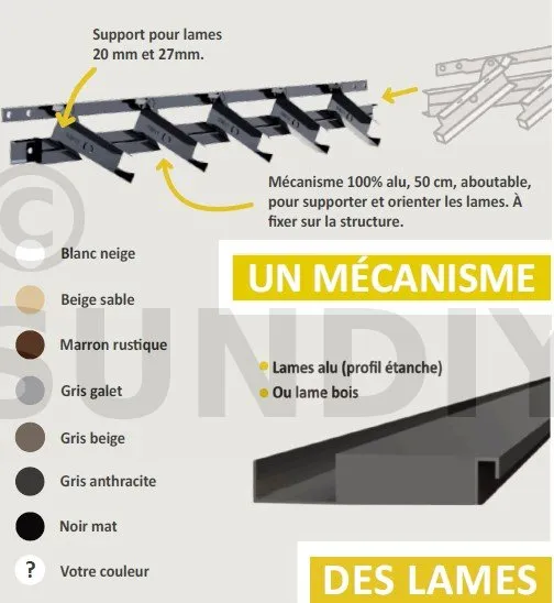 SUNDIY vous permet de personnaliser chaque aspect de votre pergola. Nos kits lames orientables pergolas comprennent différentes options comme les lames orientables pour un contrôle optimal de la lumière et de la température. Cela permet à chacun de créer un espace qui lui ressemble.