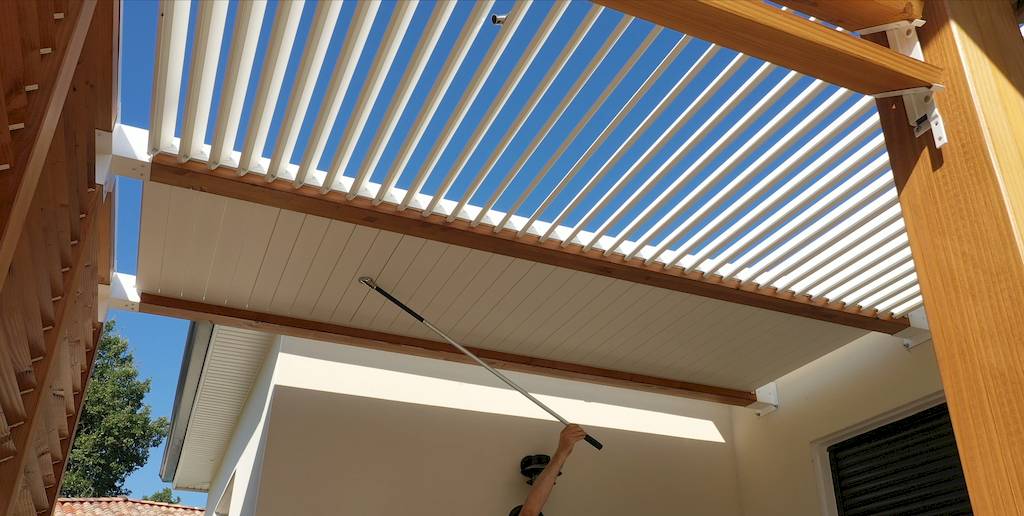 Les mécanismes de lames orientables pouvant actionner des lames aluminium ou des lames en bois transforment la pergola en un véritable système bioclimatique. Vous ajustez l’inclinaison des lames en fonction de la météo et de vos envies : ouverture totale pour profiter du soleil, fermeture partielle pour créer de l’ombre, ou fermeture complète pour vous protéger d’une averse.