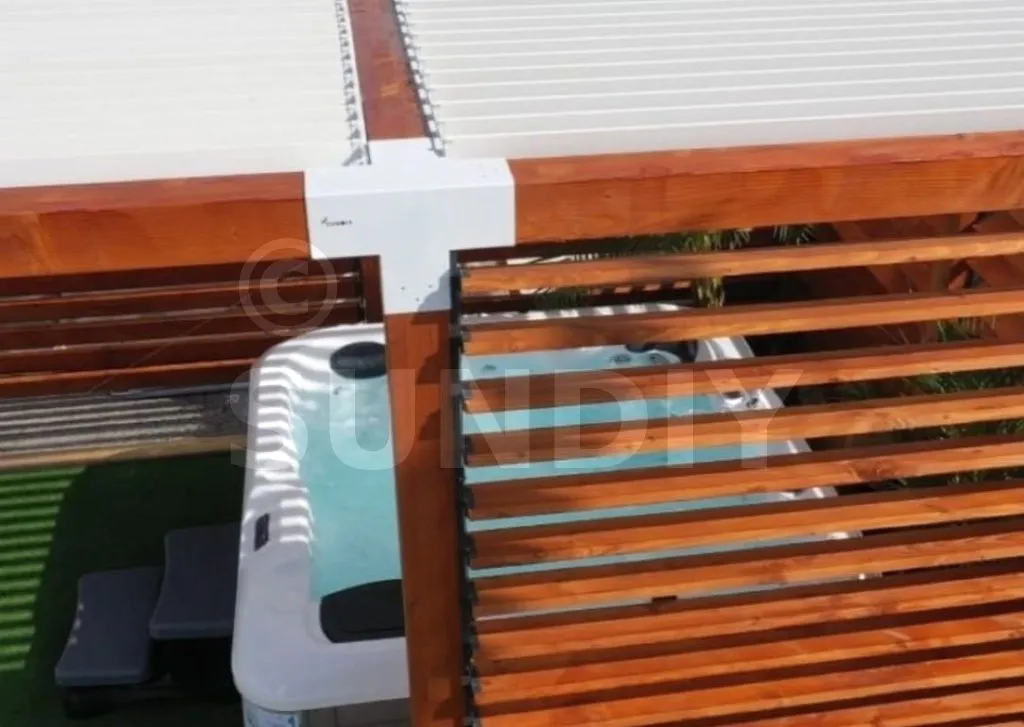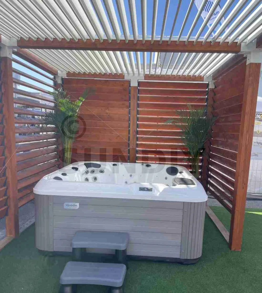 L’utilisation de lames en aluminium pour la toiture garantit une protection supplémentaire contre la chaleur, réduisant ainsi l’évaporation de l’eau du SPA. Le toit et les brise-vues offrent une protection efficace contre les impuretés extérieures, ce qui réduit la fréquence nécessaire de nettoyage.