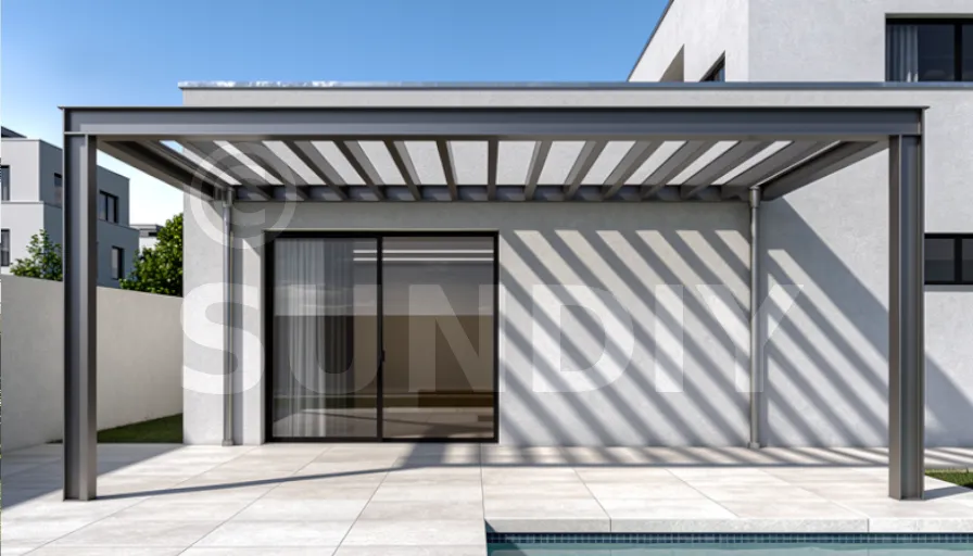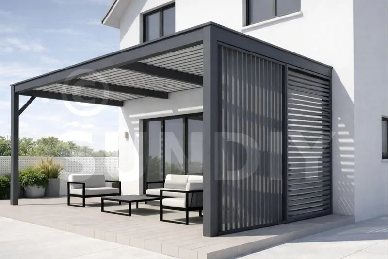 La pergola bioclimatique se reconnaît à son toit à lames orientables. Visuellement, elle donne souvent un rendu plus contemporain et plus architectural, car ses lignes sont très régulières et les ombres projetées sont marquées. Elle s’intègre particulièrement bien aux maisons modernes, mais elle peut aussi s’adapter à une maison plus classique si l’on choisit une couleur sobre et des proportions cohérentes avec la façade. Le style final dépend beaucoup des options visibles, comme les stores latéraux, l’éclairage intégré ou les panneaux décoratifs, qui peuvent rendre l’ensemble plus pièce extérieure ou au contraire plus discret.