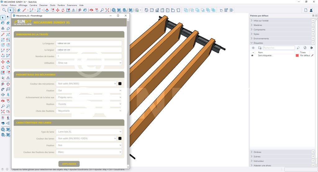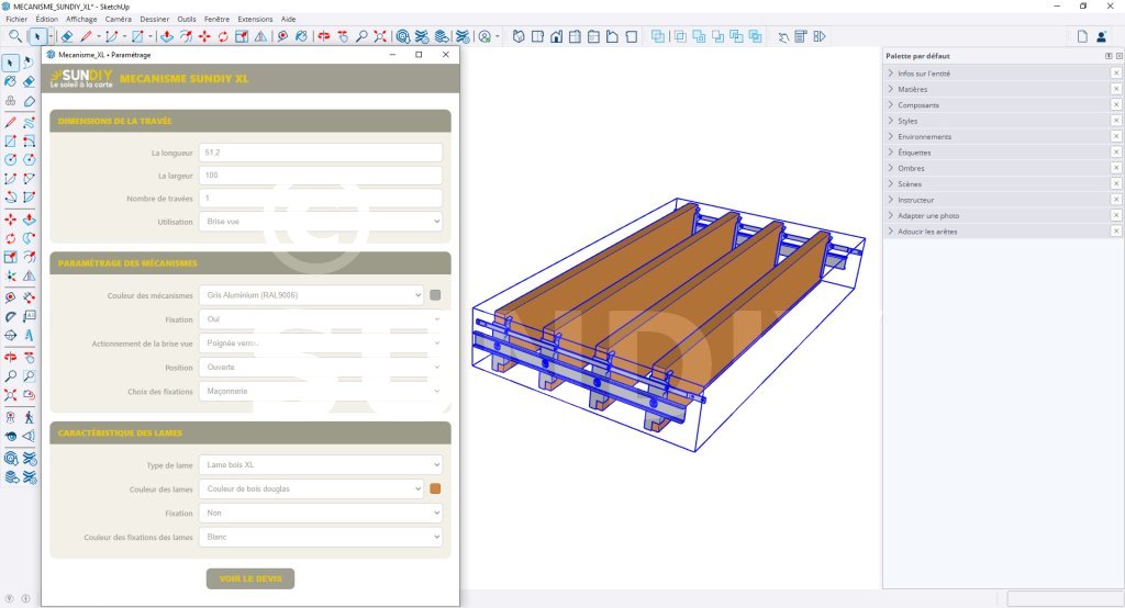 Modéliser une travée à lames orientables, ce n’est pas juste faire un faire un joli rendu 3D. Il faut choisir le bon type de lames, la couleur, les mécanismes et l’actionnement, gérer les fixations et le support (bois, maçonnerie, acier), puis obtenir un récapitulatif d’achat fiable pour commander. Mécanisme SUNDIY XL s’occupe de tout ça automatiquement et vous permet de le faire directement dans SketchUp. Le plugin associé avec ce composant fonctionne avec les versions récentes de SketchUp (2022 à 2025).