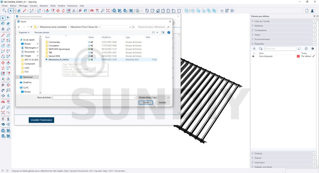 Pour utiliser cette version du composant dynamique Mécanisme SUNDIY XL, téléchargez le fichier Mecanisme_XL_full.rbz, puis suivez les étapes suivantes pour installer le plugin :