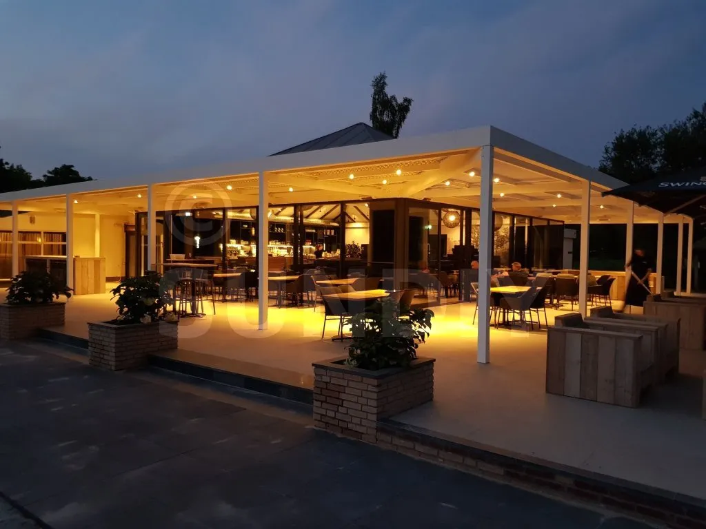 Le toit à persiennes Infinity a été développé pour le secteur de la restauration où ils servent de jour comme de nuit. C’est pour cette raison que les poutres peuvent être équipées de spots LED économes en énergie.