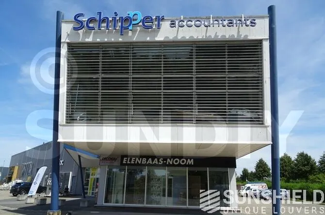 C’est ici, au bureau de comptabilité Schipper, qu’une grande fenêtre est équipée de persiennes uniques. Par Sunshield.