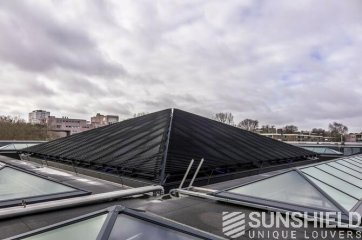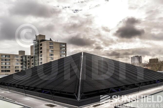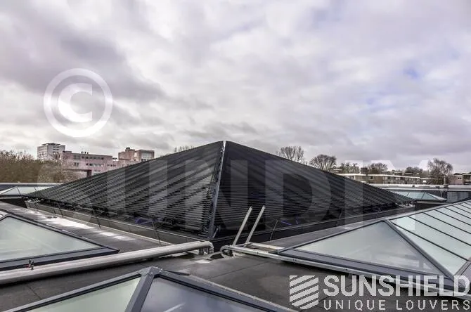 De chaque côté de la pyramide est placé un système de lamelles triangulaires. Chaque côté a une surface de 121 m2 . Comme dit, c’est énorme. Ces côtés sont actionnés indépendamment les uns des autres via un système de gestion du bâtiment. Chaque triangle est à son tour divisé en segments à actionner séparément. Donc un contrôle optimal de la position des lamelles.