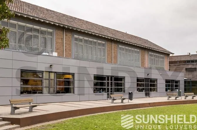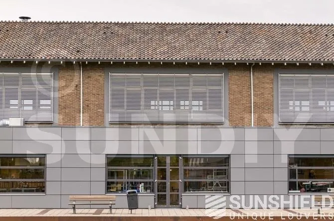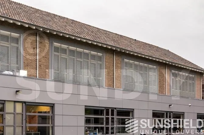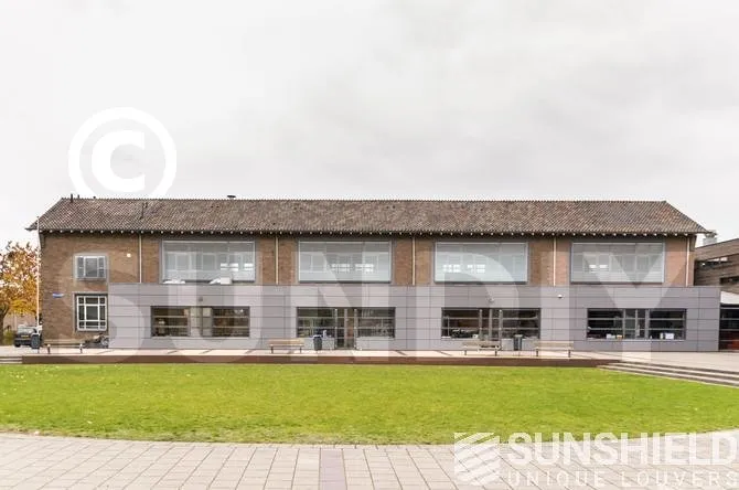 La commission scolaire a choisi le modèle de persienne 75-E . Il est doté d’une lame à face convexe et d’une largeur de 75 mm. Les côtés des systèmes de persiennes sont scellés avec des profils de finition, empêchant la lumière de pénétrer sur les côtés. De plus, il est joli. Terminé.