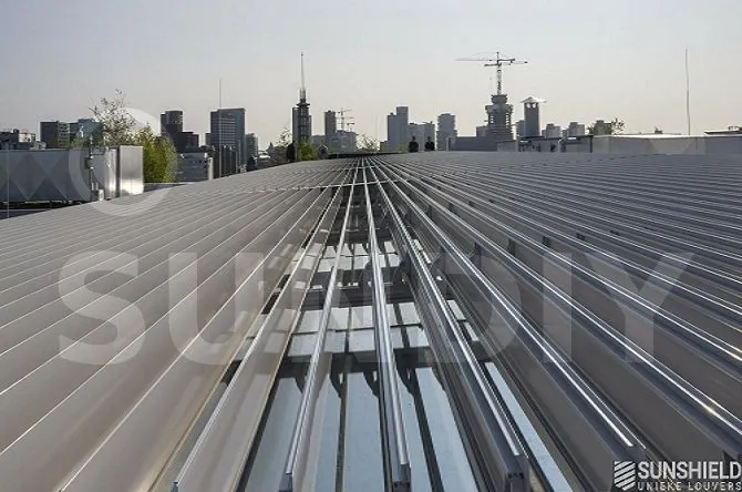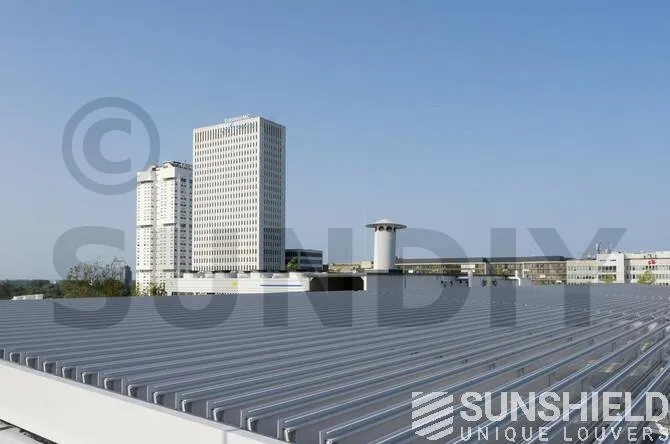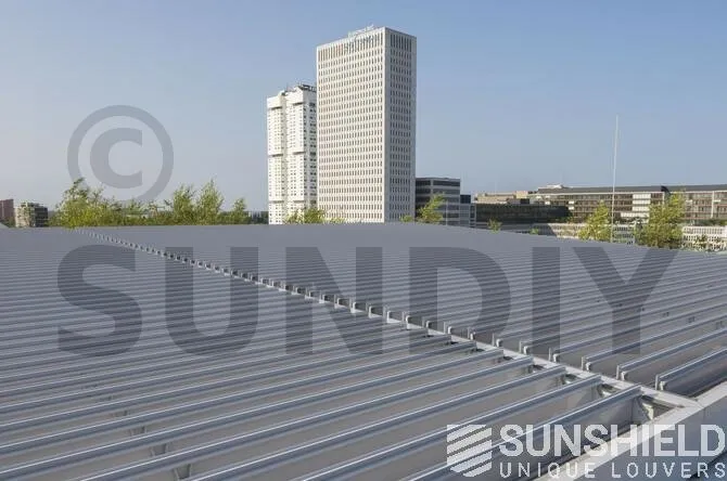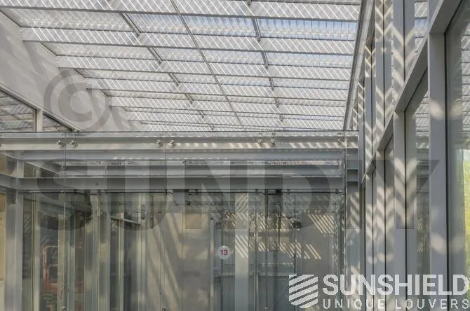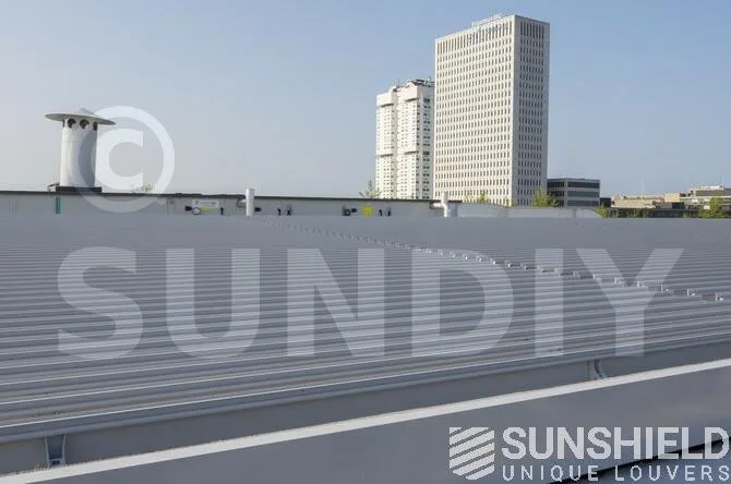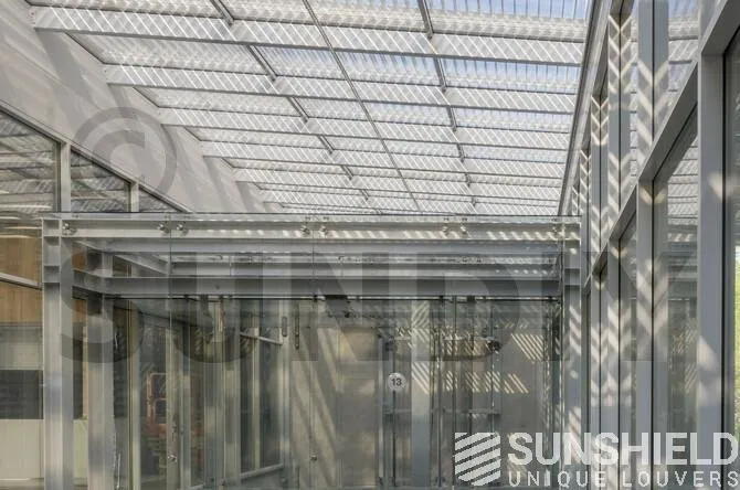 La verrière sur le toit ne fait pas moins de 206 m2. Les stores ont été placés par Sunshield. L’immense surface est divisée en cinq systèmes. La lame choisie est la persienne 155-E .