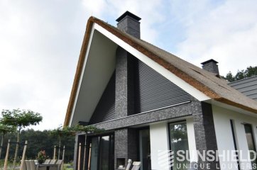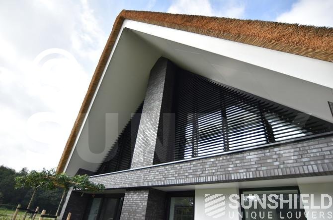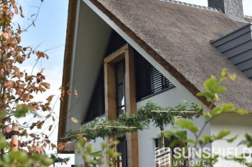 Dwingeloo se situe à peu près au cœur de Drenthe. Voici les pignons latéraux droit et gauche et la façade d’une villa rurale équipée de systèmes de persiennes. Par Sunshield.