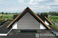 La surface totale du système d’ombrage est supérieure à 14 m². Les habitants ont opté pour la persienne 150-E, une lame d’une largeur de 150 mm. Lorsque les persiennes sont complètement ouvertes, il y a une vue de 14 cm entre les lattes.