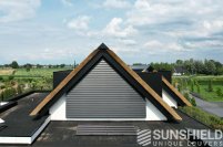 Le système de persiennes commence à la base sous la forme d’un rectangle. Vu de l’extérieur à droite, le système se transforme en triangle au bout d’un mètre environ, à gauche au bout d’un mètre et demi. Sunshield fournit des lames mobiles de n’importe quelle forme.