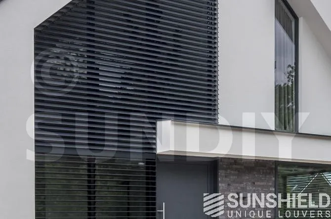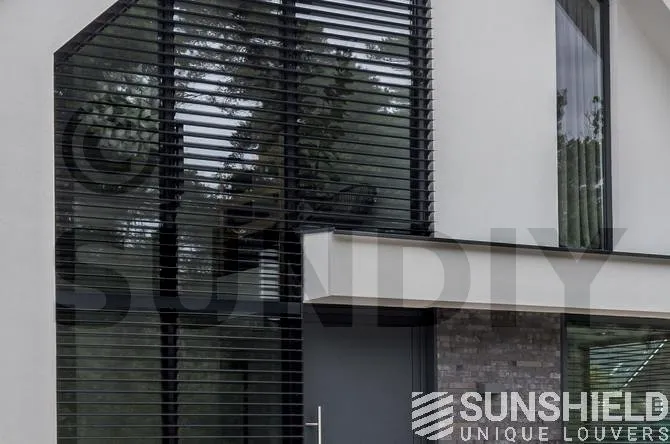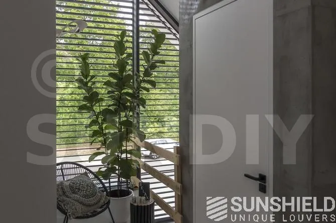 Les résidents ont opté pour la persienne 96-E. Une lame d’une largeur de 96 mm. Cette persienne a un pas de 90 mm. Cela signifie que lorsque les lames sont ouvertes, vous avez une vue de 90 mm entre les persiennes.