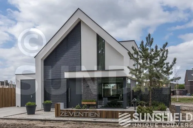 Le contraste entre les murs blancs et les persiennes noires et grises souligne le design épuré de cette belle villa. Les résidents souhaitaient une protection maximale contre la chaleur du soleil qui a bien fonctionné.
