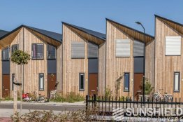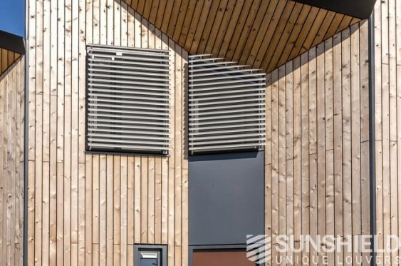 Les pièces en plastique sont fabriquées en gris clair. Les systèmes de persiennes entièrement gris offrent un joli contraste avec le revêtement en bois.
