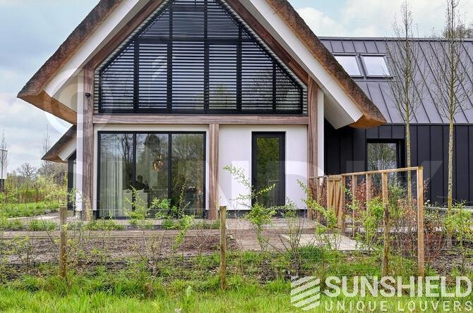 La partie inférieure rectangulaire mesure 640 mm de hauteur, avec des lames fixes inclinées à 45°. Les autres systèmes de persiennes sont motorisés et leur ouverture et fermeture sont contrôlées centralement via la domotique.