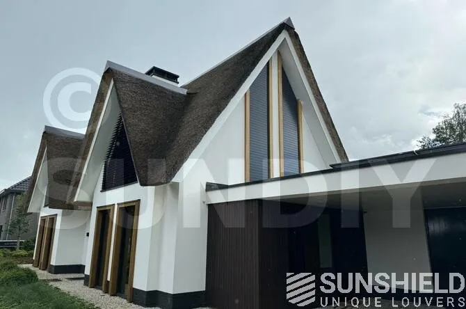 Deux systèmes de persiennes identiques sont installés en façade. Ils commencent sous forme de rectangle à la base et se transforment rapidement en triangle. Chaque store mesure 3,40 mètres de haut et de large.