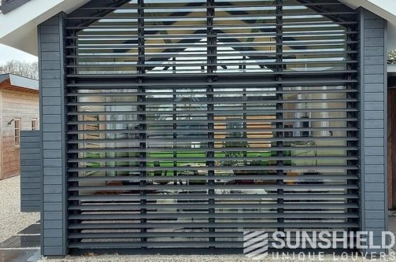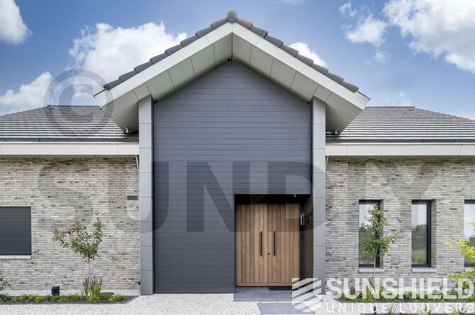 A l’entrée de la maison, un système de lamelles a été installé sur la porte d’entrée. Ce système est placé à environ 75 cm devant la façade. Cela a créé un vestibule entre les stores pare-soleil et la façade vitrée. Les résidents ont ici opté pour la persienne 150-E.