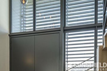 Pour les autres fenêtres de la résidence, des systèmes de lames avec la persienne 107-E ont été installés. Une persienne qui non seulement tombe l’une sur l’autre, mais aussi l’une dans l’autre. Souvent utilisée en combinaison avec des brosses sur les côtés lorsqu’un obscurcissement est nécessaire à la lumière du jour.