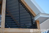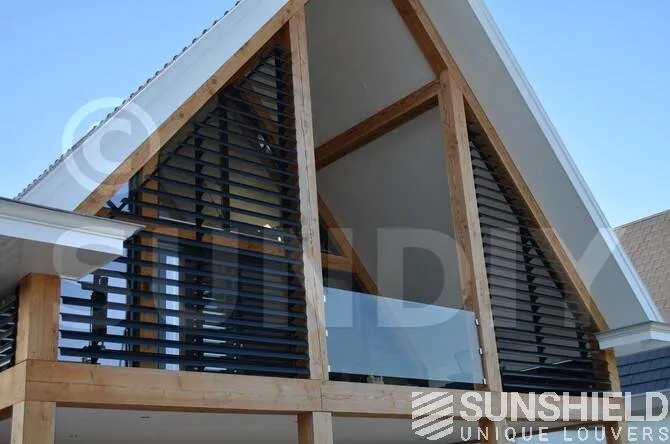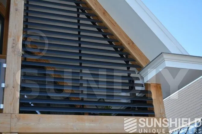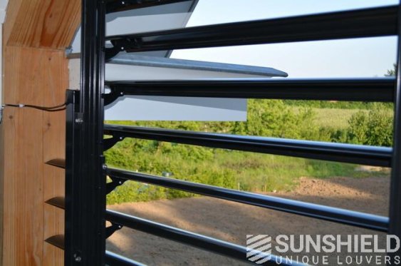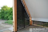Deux systèmes de persiennes trapézoïdales ont été placés sur la façade arrière. Le porche est complété par des rectangles sur les côtés. Les deux trapèzes sont actionnés sans fil. Les lamelles des systèmes latéraux sont en position fixe.