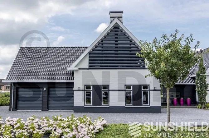 L’obscurcissement du 155-E peut être encore augmenté en installant des brosses ou des capuchons sur les côtés du système de persiennes. Les résidents ont opté pour des capots latéraux pour ce manoir.