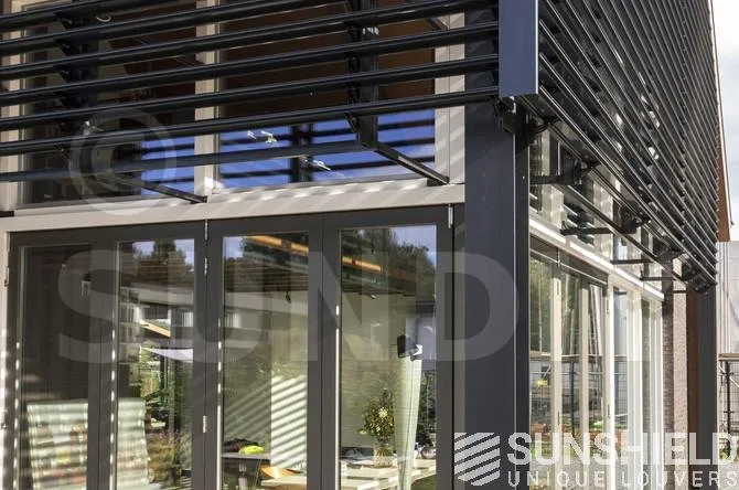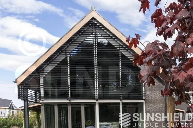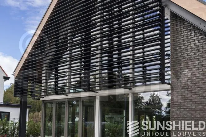 Ce système est particulièrement unique car les lames sont montées sur des chevrons. La protection solaire est ainsi légèrement éloignée du mur.