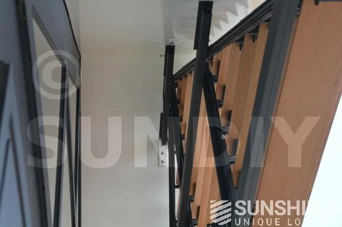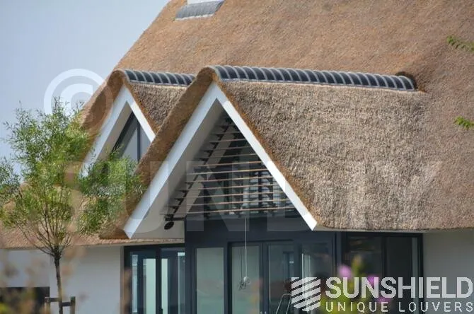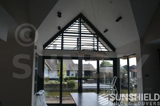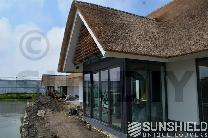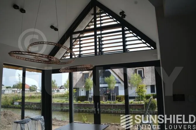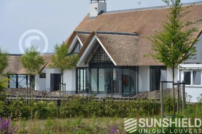 Voici une villa moderne équipée de persiennes uniques. Les résidents ont choisi la persienne 148- W. Une lame d’une largeur de 148 mm et une vue entre les persiennes de 140 mm – donc avec une bonne vue.