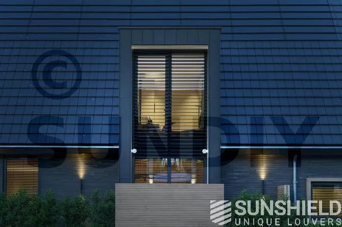 À mi-chemin de la façade gauche de cette maison spacieuse se trouve une risalite. Un système de persiennes rectangulaires a été placé devant la moitié supérieure. Chaque système d’ombrage est actionné séparément à l’aide d’une télécommande.