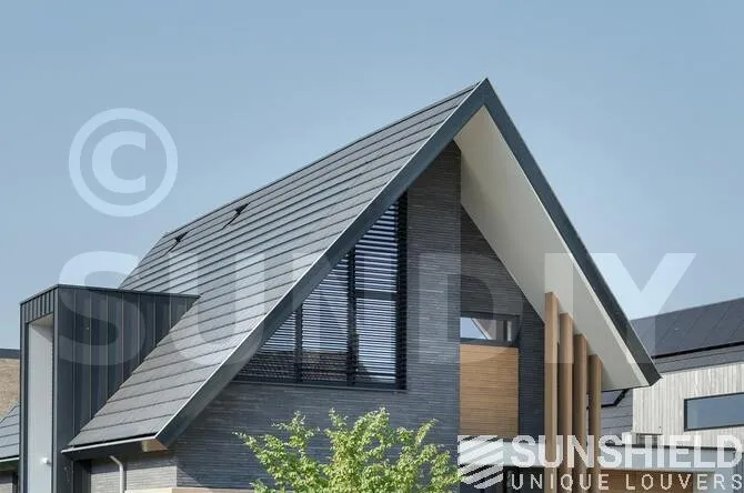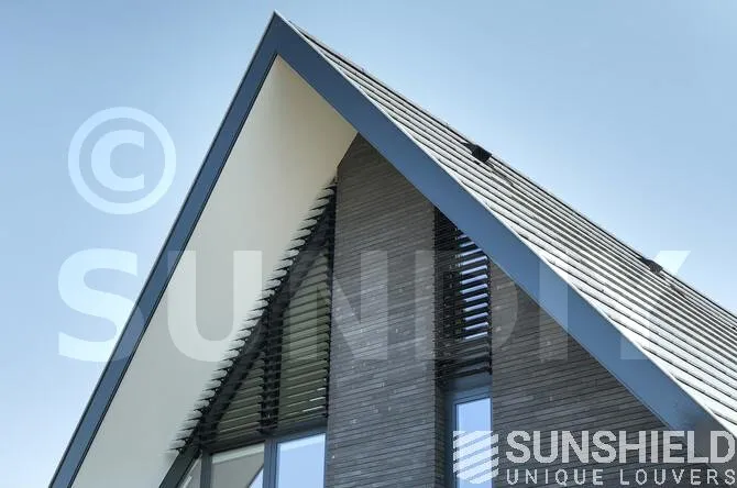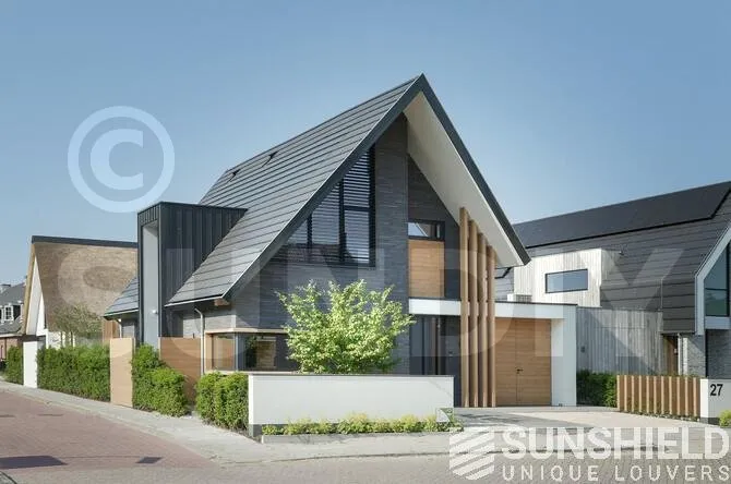 Sur la façade avant se trouve une fenêtre de chambre équipée d’un système de lamelles triangulaires. Deux auvents sont placés à l’arrière. L’un a la forme d’un trapèze, l’autre celle d’un triangle.