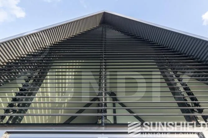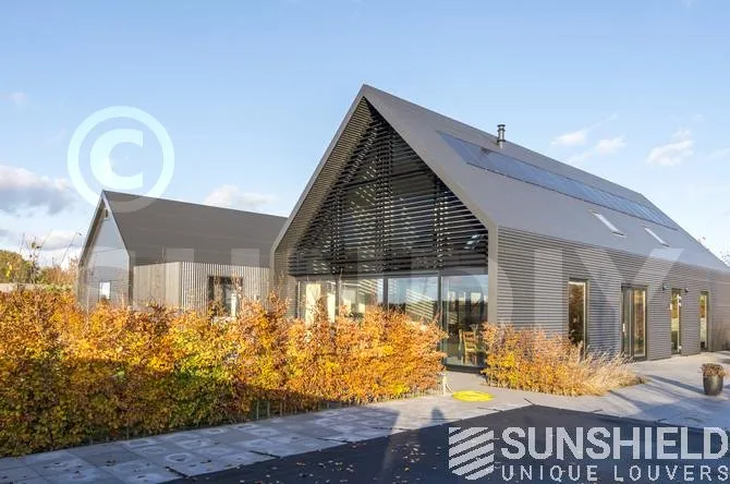Le triangle au-dessus de la façade mesure plus de 22 m². Sunshield a équipé le triangle arrière de lames uniques. Les parties gauche et droite de ce store sont toutes deux équipées d’un moteur et peuvent être actionnées séparément.