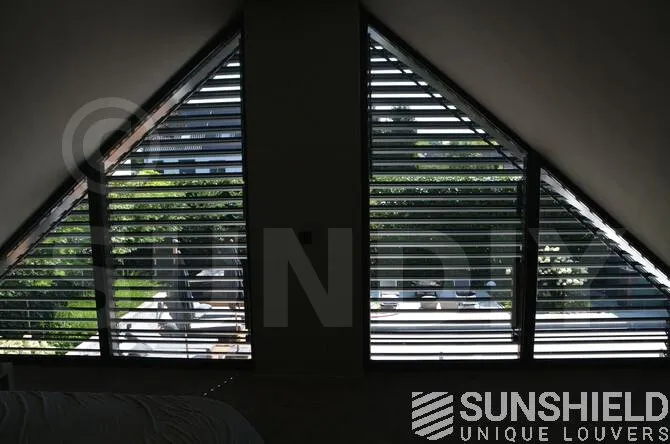Les deux façades ont deux fenêtres dans une niche qui commence à la base comme un rectangle, mais se transforme rapidement en une forme triangulaire. Les systèmes de lattes suivent ces formes géométriques.