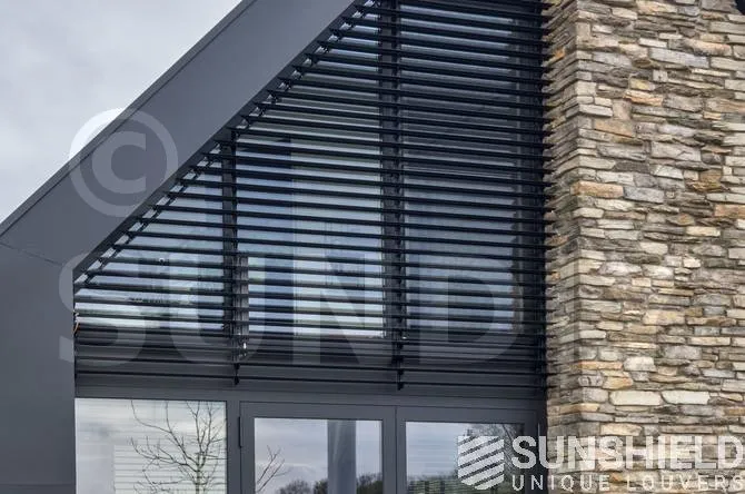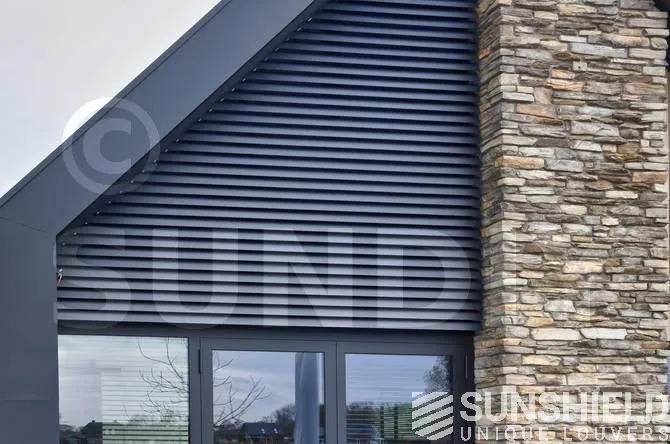Sunshield a équipé cette maison individuelle de persiennes uniques. Un système de persiennes triangulaires a été placé pour la fenêtre côté rue et un autre devant la fenêtre arrière.