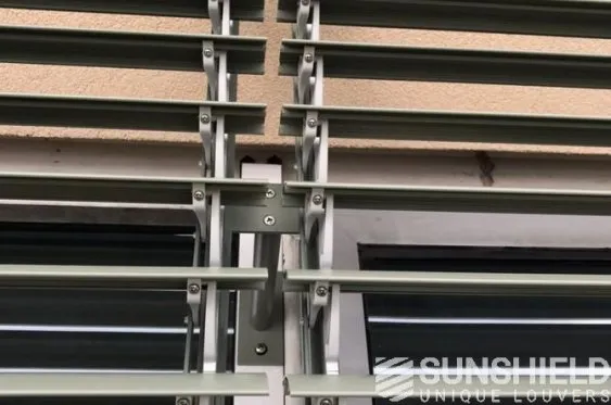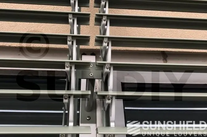 La lame choisie est la 75-E, avec une lame d’une largeur de 75 mm et à face avant convexe. Les parties en aluminium sont finies en RAL 7033, gris ciment. Les parties en plastique sont grises.