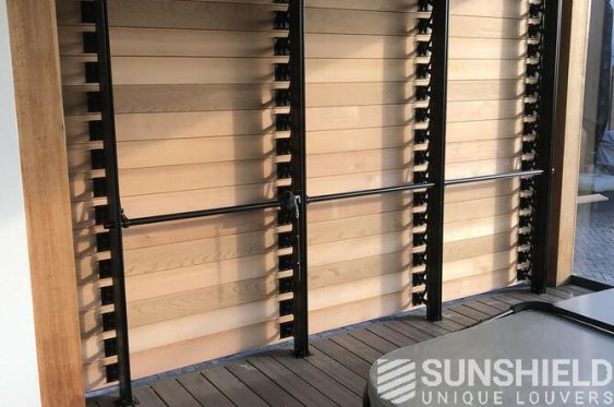 Cet auvent est équipé d’un mur à lames de Sunshield. Grâce à ce mur, les résidents peuvent choisir de rester à l’intérieur ou de s’abriter à l’extérieur sous le toit.