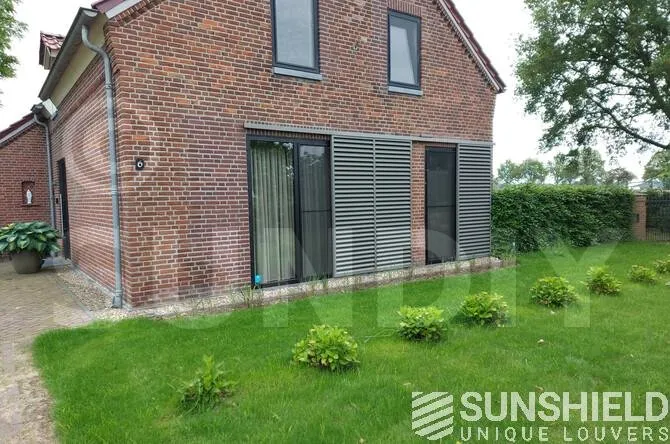 Dans cette maison individuelle, le pignon côté rue est équipé de deux systèmes de persiennes coulissantes. Le panneau gauche est constitué de deux segments, mesure 2 m de large et est motorisé.
