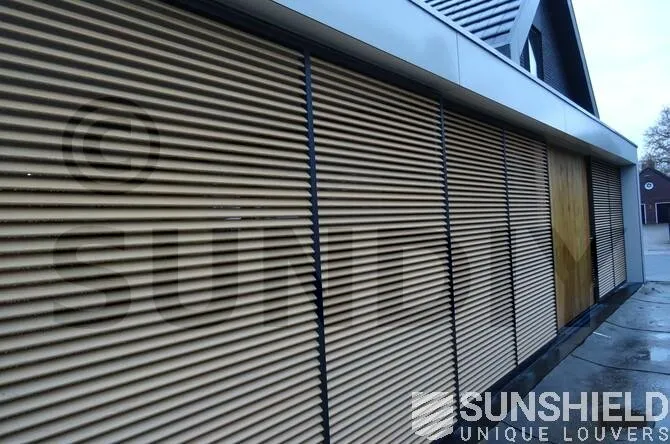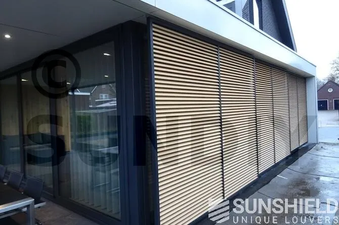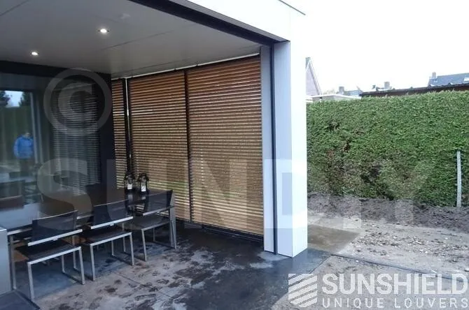 Un système de persiennes avec la lame 75-E a été placé sur la façade avant. Les lattes sont placées à un angle fixe. Le mur latéral gauche a des portes coulissantes, plusieurs panneaux coulissants ont été placés ici. Un total de trois unités de chacun deux éléments de 1550 x 2600 mm.