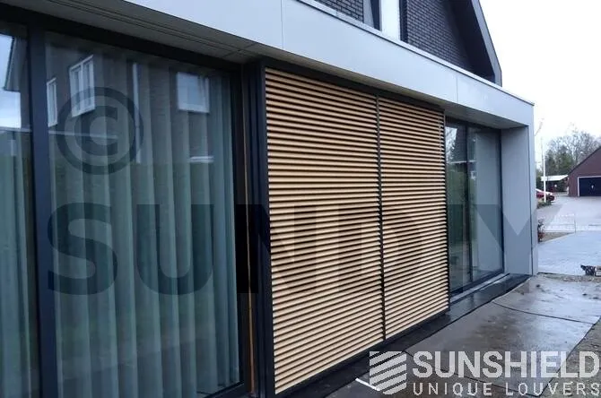 Toutes les lames, y compris celles des panneaux coulissants, sont fabriquées en bois d’élan. Les autres composants en aluminium sont peints en RAL 7021, gris noir. Les pièces en plastique sont noires.