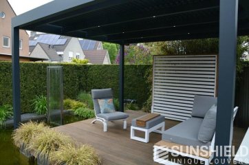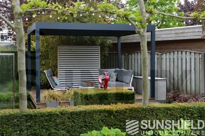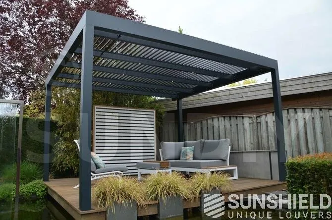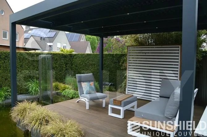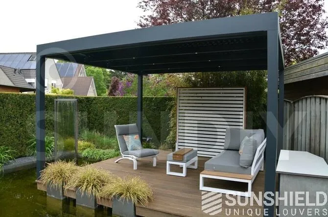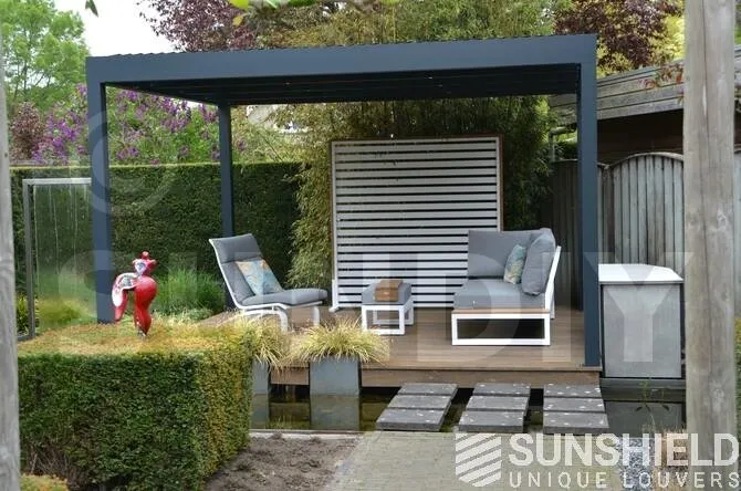 La terrasse et le toit à persiennes Nautilus sont installés sur une plateforme, entourée d’un plan d’eau et d’espaces verts aménagés.