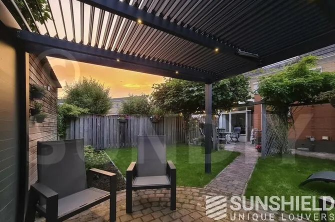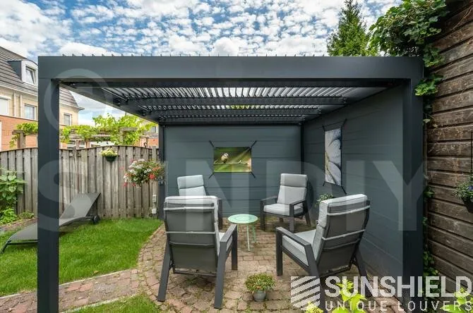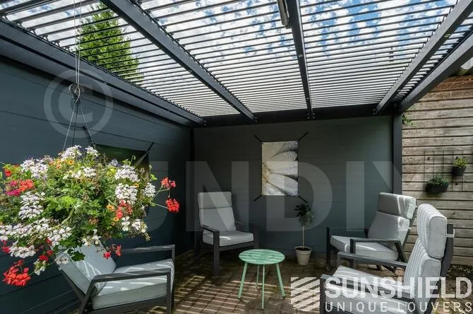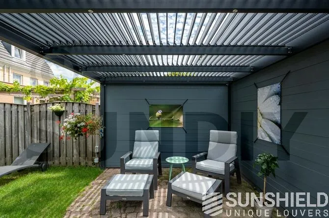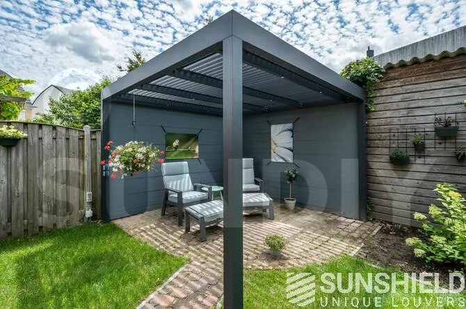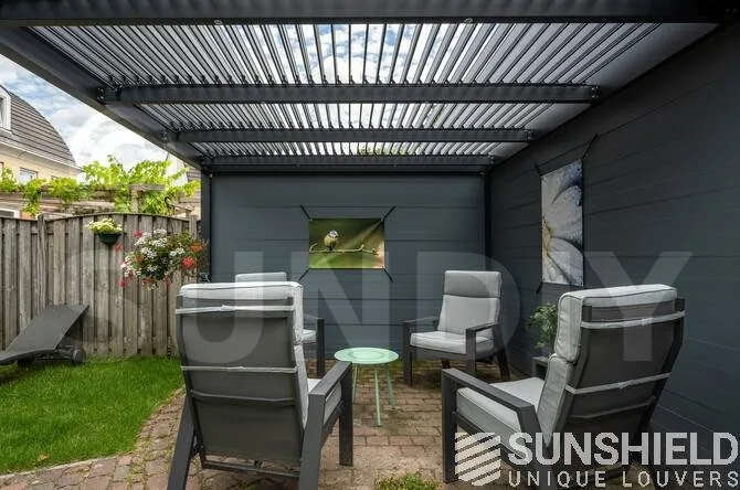 Le toit à lames SUNSHIELD Nautilus est entièrement en aluminium. Les dimensions de ce toit à lames sont de 350 x 350 cm, avec une hauteur de 240 cm et une hauteur de passage de 220 cm. La structure du toit à lames a une hauteur de 20 cm. Les colonnes mesurent 11 x 11 cm.