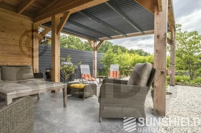 Le toit à lames Atlantis est étanche grâce à ses lames fermées. Les lames 117-E se chevauchent et s’imbriquent, créant ainsi une surface imperméable.