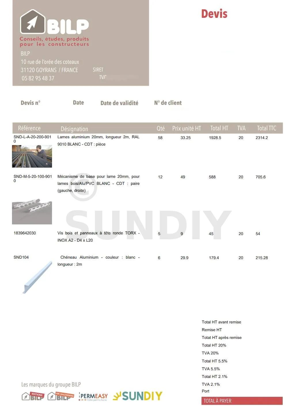 Vous recevrez des devis détaillés qui vous offriront une vision claire et précise de votre projet. Chacun jouant un rôle bien défini : l’un dédié à la structure, si besoin, et un autre spécifique à l’équipement (lames/mécanismes/etc.). Cette approche vous permettra d’avoir une meilleure visibilité sur le budget global et de prendre des décisions éclairées.