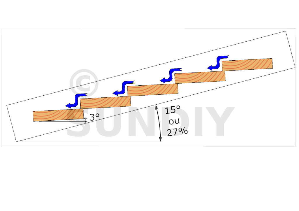 Bien qu’elles n’ont pas de gouttière, elles peuvent se révéler étanche selon la pente de la toiture. Pour illustrer cela voici des schémas qui montre le degrés de pente à respecter et la disposition des lames pour que vos lames en bois ne laisse plus passer l’eau.