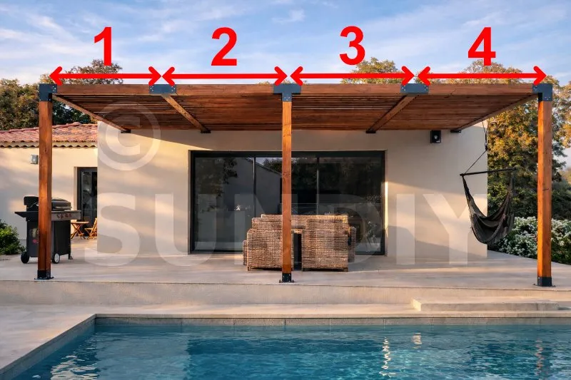 Par exemple, pour couvrir une longueur totale de 6 mètres avec des lames aluminium de 3 mètres, la structure sera simplement divisée en deux travées indépendantes de 3 mètres chacune. Avec des lames en bois la même structure sera divisée en 3 travées de 2 mètres.